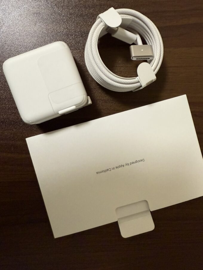 その他封入物はこんな感じ。充電ケーブルとミニ冊子程度。実にシンプル。昔のパソコン(Windows)はね、分厚いマニュアルやらCD-ROMやら、ごっつい充電器やら、いろいろと同梱されていたものだった…。(遠い目)