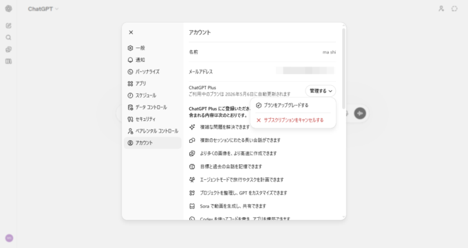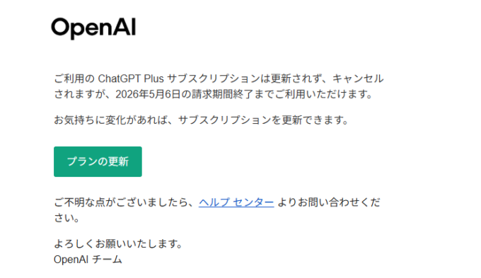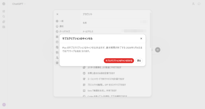 ChatGPT有料版の解約画面