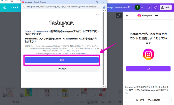 (4)ここで別窓が開き、Instagramとの連携を許可するよう求められます。「許可」ボタンをクリックしましょう。人によっては、パスワードを入れろとか、認証しろと表示されるかも知れませんので、その際は画面の指示に従ってください。