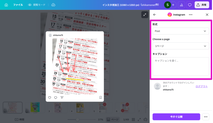 Canva内のどのページを投稿するか指定