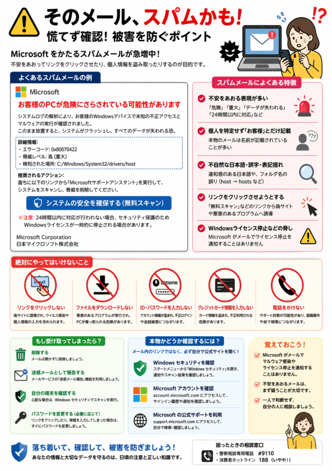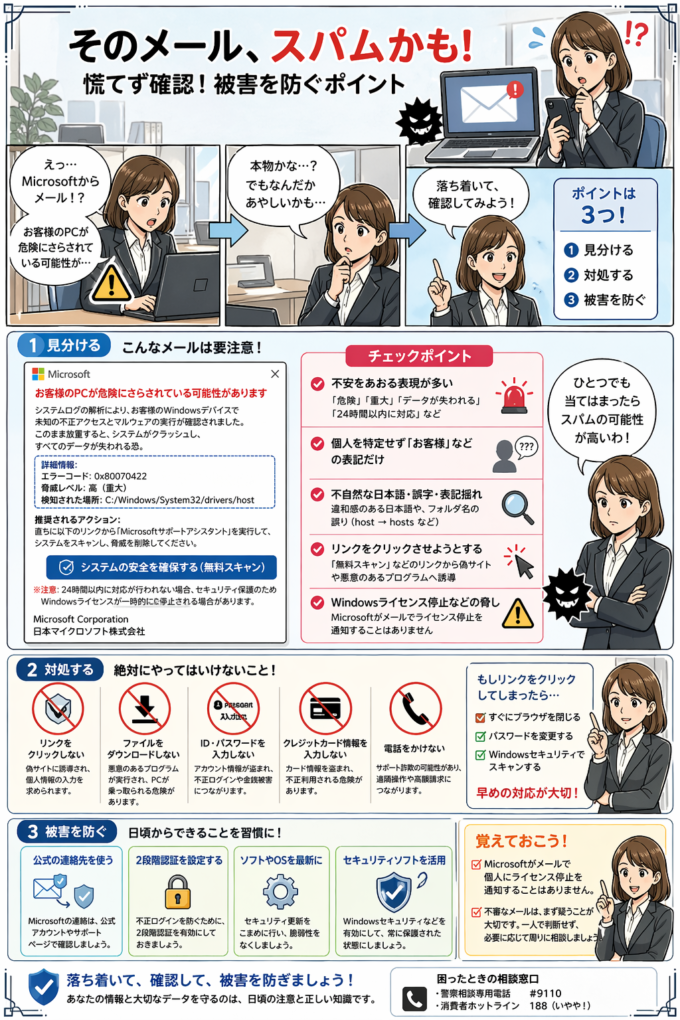 不安をあおるメールほど、一呼吸おいて確認することが被害防止につながります。大切な情報や取引先との信頼を守るためにも、まずは“慌てない”こと。